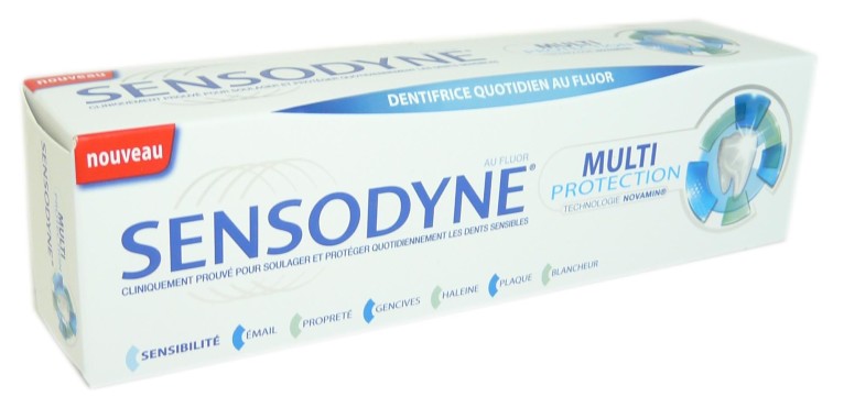 Lorsque la dentine située sous l’émail est mise à nue, la dent exposée au chaud ou au froid devient extrêmement sensible. Sensodyne propose une gamme complète de soins bucco-dentaires qui offrent une solution efficace aux problèmes de sensibilité dentaire. SENSODYNE Multi-Protection est un dentifrice spécialement conçu pour protéger les zones fragilisées. Sa formule associe fluor et novamine pour renforcer l’émail contre les attaques acides, lutter contre la formation de la plaque dentaire, réduire l’inflammation des gencives et éviter les saignements.