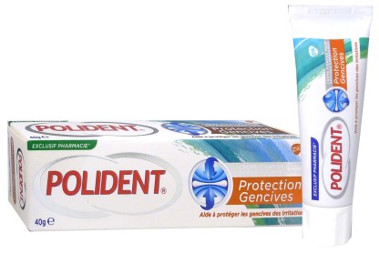 La gamme POLIDENT du laboratoire GSK (GlaxoSmithKline ou Santé Grand Public) est composée de produits d’hygiène bucco-dentaire pour un confort buccal et dentaire au quotidien conçus spécialement pour les prothèses partielles. La crème fixative Protection gencives forme une barrière protectrice entre les gencives et l’appareil pour éviter l'infiltration des particules alimentaires et ainsi conserver des gencives saines et non douloureuses. Elle fixe instantanément dans toutes les directions et pendant toute la journée l’appareil sans avoir de mouvements.