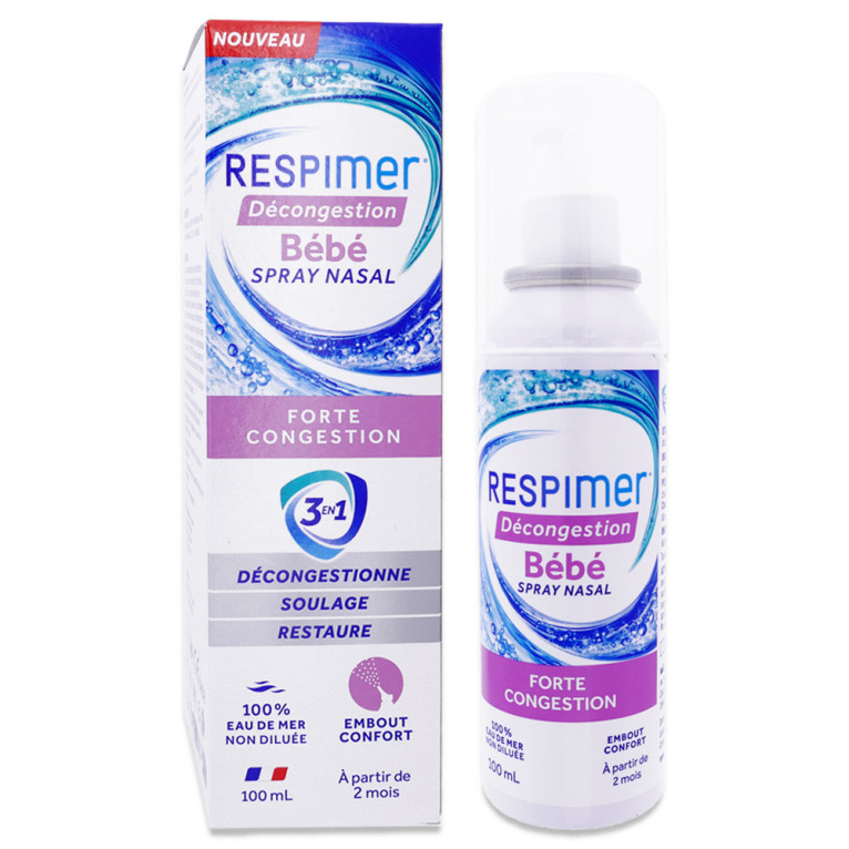 RESPIMER SPRAY DECONGESTION BEBE SPRAY NASAL 100ML est en vente en ligne sur le site de votre parapharmacie à prix discount, conçu pour nettoyer en douceur les fosses nasales des bébés dès 2 mois.