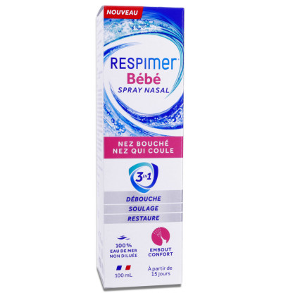 RESPIMER SPRAY NASAL BEBE 100ML est en vente en ligne sur le site de votre parapharmacie à prix discount, destiné à soulager le nez bouché et qui coule chez les bébés dès 15 jours.