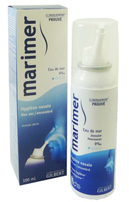 Le spray nasal MARIMER des laboratoires GILBERT est un dispositif médical formulé à base d’eau de mer naturelle puisée dans le Parc Naturel marin d'Iroise très riche en sels minéraux et oligo-éléments marins. Ce spray adapté à toute la famille, nettoie les fosses nasales, aide à l'évacuation en douceur des sécrétions nasales, soutient l’humidification naturelle des parois nasales, lutte contre la sécheresse des muqueuses. Il est recommandé en lavage quotidien en prévention du rhume et des infections ORL, en cas de nez encombré et sec.