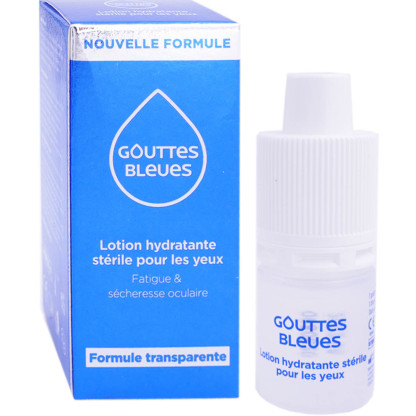Gouttes Bleues, est une solution oculaire en lotion hydratante stérile, composée de hyaluronate de sodium, eau de camomille hamamélis et bleuet. Elle va apaiser dès la première utilisation les yeux secs, irrités et fatigués, hydrater intensément les yeux, pour une hydratation en continu et un confort immédiat et durable.