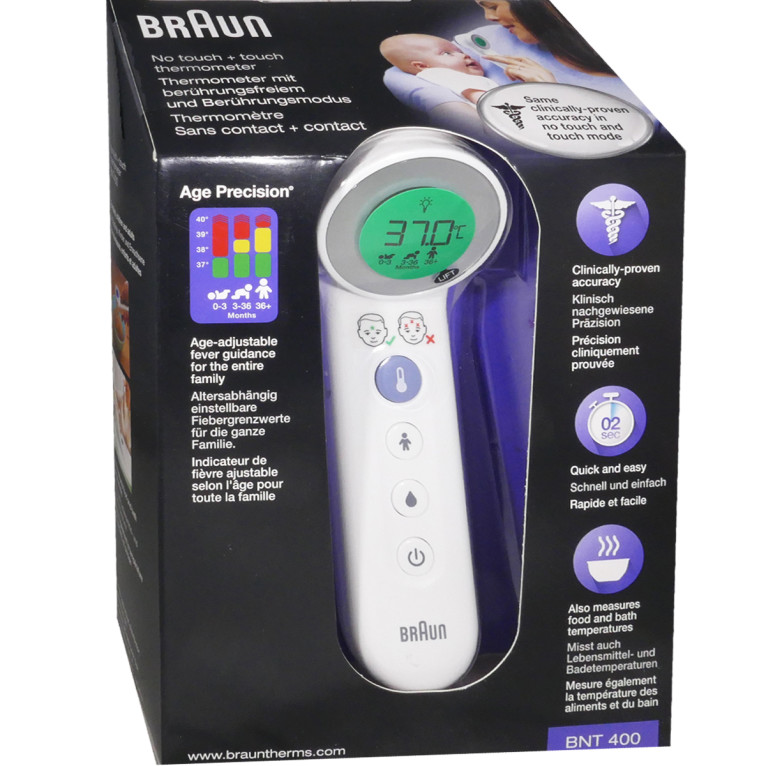BRAUN conçoit des appareils pour le bien-être et le confort de chacun comme les rasoirs, les épilateurs, et thermomètres. Le Thermomètre BNT400 est un thermomètre frontal nouvelle génération. Sa technologie permet d’indiquer la température selon l’âge de la personne. La température habituelle varie selon l’âge de la personne, c’est pour cela que BRAUN a conçu la technologie Age Precision® IRT6520 pour une prise de température très précise. Son affichage couleur permet par l’échelle graduée d’interpréter le risque de fièvre. Sa technologie permet d’indiquer la température en seulement 2 secondes, et un système optique pour le bon positionnement du thermomètre. Intelligent, il indique précisément, l’endroit et la distance pour une prise correcte de la température grâce à son système de guidage du positionnement. Pratique, il mémorise les 9 dernières prises de températures pour un suivi optimal. Il est doté d’un écran rétro éclairé pour éviter de réveiller bébé quand il dort. Testé cliniquement
