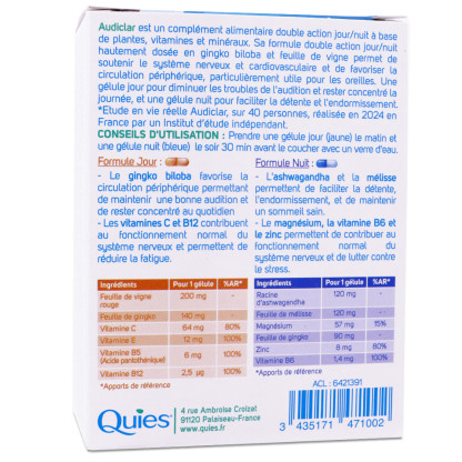 Le laboratoire QUIES propose une solution innovante avec sa formule jour et nuit. La formule jour contient du gingko biloba, qui contribue à maintenir une bonne circulation sanguine pour le maintien d'une bonne audition et rester concentré au quotidien, ainsi que les vitamines C et B12, qui participent au fonctionnement normal du système nerveux et contribuent à réduire la fatigue. La formule nuit associe l'ashwagandha et la mélisse, qui soutiennent la relaxation et contribuent au maintien d'un sommeil de qualité. Le magnésium,, la vitamine B6 et le zinc présents dans cette formule, contribuent au fonctionnement normal du système nerveux.
