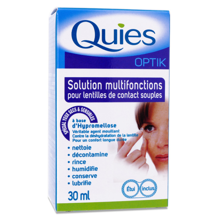 Précaution d’emploi et contre-indications : Evitez d’utiliser des savons agressifs et gras pour vous laver les mains. Rincez et séchez vos mains avant de manipuler vos lentilles. Vérifiez que l’endroit où vous manipulez vos lentilles est propre et sans poussière. Si vous effectuez le nettoyage de vos lentilles au-dessus d’un lavabo, veillez à ce que la bonde soit fermée. Nettoyez et décontaminez toujours les lentilles avant de les replacer sur l’œil. Ne réutilisez jamais de la solution QUIES OPTIK ayant déjà servi ou restant dans l’étui. Ne conservez pas et ne rincez pas vos lentilles avec l’eau du robinet. Utilisez uniquement l’étui de trempage fourni pour conserver vos lentilles. Assurez-vous que vos lentilles sont entièrement immergées dans la solution. N’utilisez jamais de lentilles n’ayant pas été parfaitement humidifiées dans la solution QUIES OPTIK. Conservez toujours l’étui de trempage propre. Chaque semaine, lavez et rincez-le à l’eau du robinet et laissez-le sécher à l’air libre. Vérifiez que la lentille n’ait pas été retournée avant de la poser. Lors de la pose de vos lentilles, commencez toujours par le même œil afin d’éviter toute confusion. Il est impossible que la lentille se perde dans l’œil. Utilisez un miroir pour la localiser, elle se trouvera probablement sous la paupière. Ne recentrez pas la lentille sur la cornée avec votre doigt. Utilisez plutôt vos paupières pour la déplacer et la repositionner. Évitez de toucher les lentilles avec vos ongles. Assurez-vous que vos ongles soient courts et lisses. N’utilisez pas une lentille endommagée ou tordue. Évitez de vous frotter les yeux après avoir mis en place vos lentilles. Cela peut irriter l’œil ou déplacer les lentilles. Veillez à ce que vos lentilles ne soient pas en contact avec des lotions, des savons, des crèmes, des déodorants, des sprays capillaires et des produits cosmétiques. Cela peut entraîner une infection ou une irritation de l’œil. Maquillez-vous uniquement après avoir mis en place vos lentilles. Suivez les recommandations de votre spécialiste. Un mauvais entretien peut causer de graves infections oculaires. Consultez votre ophtalmologiste avant de changer de solution. Les solutions d’entretien sont différentes et ne sont pas forcément compatibles avec toutes les lentilles. N’utilisez pas de médicament ophtalmique en même temps que ce produit sans avis médical. Si une irritation ou si votre vision est affectée, cessez le port des lentilles et consultez votre spécialiste. Ne laissez pas à la portée des enfants. Les lentilles peuvent se conserver jusqu’à 30 jours dans un étui fermé. Si vous souhaitez les remettre après ces 30 jours, il est important de les re-nettoyer en suivant le processus classique de nettoyage. Utilisez la solution dans les 3 mois après ouverture du flacon. N’utilisez pas après la date de péremption. Pour éviter toute contamination, évitez tout contact de l’embout du flacon avec une surface quelconque. Refermez bien le bouchon après usage. N’utilisez pas si le film plastique au niveau du bouchon est endommagé. Évitez d’utiliser des maquillages de type eye-liner, car ils pourraient colorer vos lentilles. Ne portez pas vos lentilles pendant la nuit. Évitez de porter les lentilles en présence d’émanations, de vapeurs irritantes et dans des environnements enfumés ou poussiéreux. Cela pourrait irriter vos yeux et/ou endommager vos lentilles. Portez toujours des lunettes de natation si vous nagez en portant vos lentilles. En vacances, emportez une quantité suffisante de solution QUIES OPTIK. Assurez-vous d’avoir une paire de lentilles de contact de rechange. Consultez régulièrement votre ophtalmologiste pour un contrôle de routine Tenir hors de portée des enfants.
