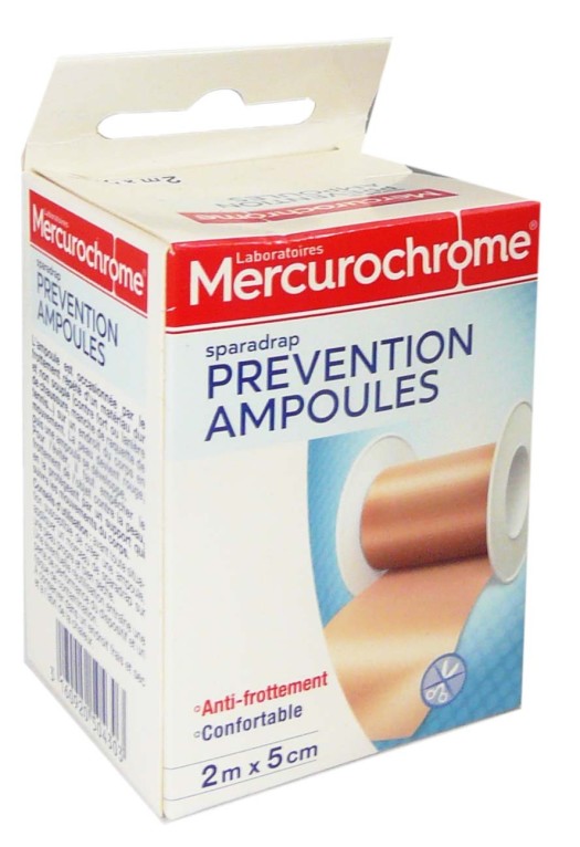 Depuis 1917 Mercurochrome est la marque fidèle aux familles, devenue l’alliée de tous les genoux écorchés avec la création de la fameuse petite bouteille rouge. Aujourd’hui, la vocation de Mercurochrome reste identique : proposer des produits de premiers soins de qualité et accessibles, pour offrir une solution efficace à tous les petits bobos du quotidien. Le sparadrap prévention ampoules de Mercurochrome, en dérouleur de 2m avec une larguer de 5 cm, qui se découpe très facilement à la main, est spécialement conçu pour prévenir la formation des ampoules. Ce sparadrap épouse totalement l’épiderme et suit le mouvement de l’articulation, isolant ainsi la peau du frottement des chaussures.