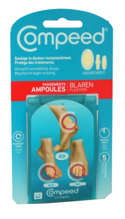 Le laboratoire COMPEED a conçu des pansements pour les problèmes de pieds (cors, ampoules) et des produits pour les boutons de fièvre. Les pansements aux différents formes adaptés aux orteils, au talon et au pouce du pied, favorisent la cicatrisation de l'ampoule, protègent du frottement que peut causer les chaussures ainsi que de l'eau, des impuretés et des bactéries, et calment la douleur grâce à la technologie hydrocolloïde qui se compose d’un gel de particules aux pouvoirs absorbants afin d’absorber l’humidité. Ils restent confortables sans gêner pendant la marche et les mouvements du pied en formant "une seconde peau". Pratique, il n'est pas nécessaire de changer tous les jours les pansements. Très résistants, ils tiennent bien en place pendant plusieurs jours et en toute discrétion. Les pansements COMPEED peuvent être aussi utilisés pour prévenir l'apparition d'ampoules sur les
