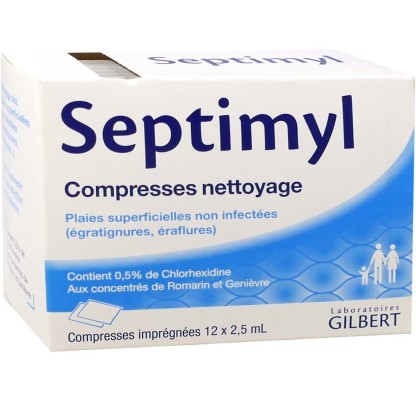 SEPTIMYL Compresses des laboratoires GILBERT, L’expertise au meilleur prix dans une solution désinfectante en format pratique pour nettoyer les petites plaies (égratignures, éraflures,…). Enfants et adultes (à partir de 3 ans)