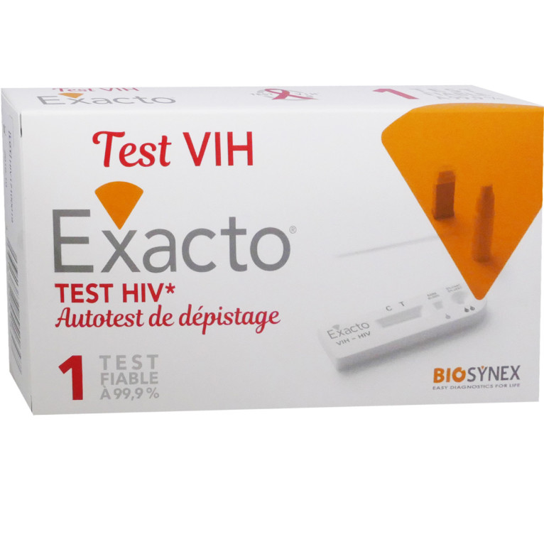 Le test VIH EXACTO fiable à 99,9%, détecte la présence dans le sang des anticorps dirigés contre l'agent pathogène responsable du SIDA (syndrome de l’immunodéficience acquise) très rapidement. Très facile à évaluer par ses lignes de couleur il permet de s'auto-contrôler. 2 lignes: séropositivité probable ; 1 ligne: séronégativité probable. En seulement 10 minutes et grâce à une micro-goutte de sang, le résultat s'affiche. Pour un résultat efficace, le test VIH EXACTO doit être réalisé au moins 3 mois après le dernier risque d’exposition.