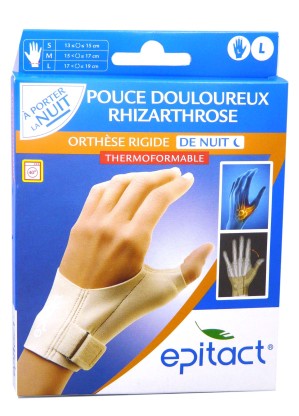 Le laboratoire EPITACT a conçu des produits pour apporter soin et confort aux problèmes de pieds. L’orthèse corrige en immobilisant et luttant contre la rhizarthrose qui fait souffrir. Elle permet de faire un écart entre le pouce et l’index pour que le pouce soit au repos et ainsi évite tout traumatisme grâce à sa conception brevetée la technologie thermoformable. En l’utilisant plusieurs fois, le pouce sera progressivement ré-axé. Souple, légère et ultrafine, l’orthèse prend la forme de la main après avoir été immergée dans l’eau chaude et ne gênera pas pendant le sommeil. L’orthèse se lave en machine à 40°C pour une bonne protection longue durée.