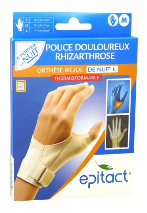 Le laboratoire EPITACT a conçu des produits pour apporter soin et confort aux problèmes de pieds. L’orthèse corrige en immobilisant et luttant contre la rhizarthrose qui fait souffrir. Elle permet de faire un écart entre le pouce et l’index pour que le pouce soit au repos et ainsi évite tout traumatisme grâce à sa conception brevetée la technologie thermoformable. En l’utilisant plusieurs fois, le pouce sera progressivement ré-axé. Souple, légère et ultrafine, l’orthèse prend la forme de la main après avoir été immergée dans l’eau chaude et ne gênera pas pendant le sommeil. L’orthèse se lave en machine à 40°C pour une bonne protection longue durée.