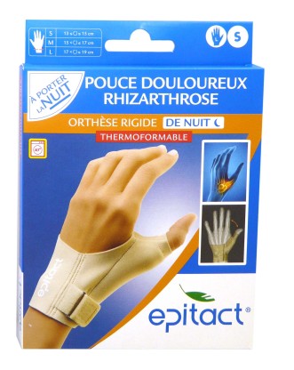 Le laboratoire EPITACT a conçu des produits pour apporter soin et confort aux problèmes de pieds. L’orthèse corrige en immobilisant et luttant contre la rhizarthrose qui fait souffrir. Elle permet de faire un écart entre le pouce et l’index pour que le pouce soit au repos et ainsi évite tout traumatisme grâce à sa conception brevetée la technologie thermoformable. En l’utilisant plusieurs fois, le pouce sera progressivement ré-axé. Souple, légère et ultrafine, l’orthèse prend la forme de la main après avoir été immergée dans l’eau chaude et ne gênera pas pendant le sommeil. L’orthèse se lave en machine à 40°C pour une bonne protection longue durée.