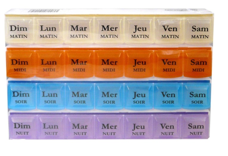 Cet étui en plastique rigide et coloré contient 28 compartiments. Il est divisé en 7 cases (jours de la semaine) par 4 rangées (blanc, orange, bleu, violet) qui correspondent à un moment de la journée (matin, midi, soir, nuit). Ces rangées permettent de se prendre individuellement pour un transport facile. Le couvercle de chaque petite boite à bascule s’ouvre et se ferme facilement pour une prise tout en sécurité des médicaments sans ouvrir d’autres cases.
