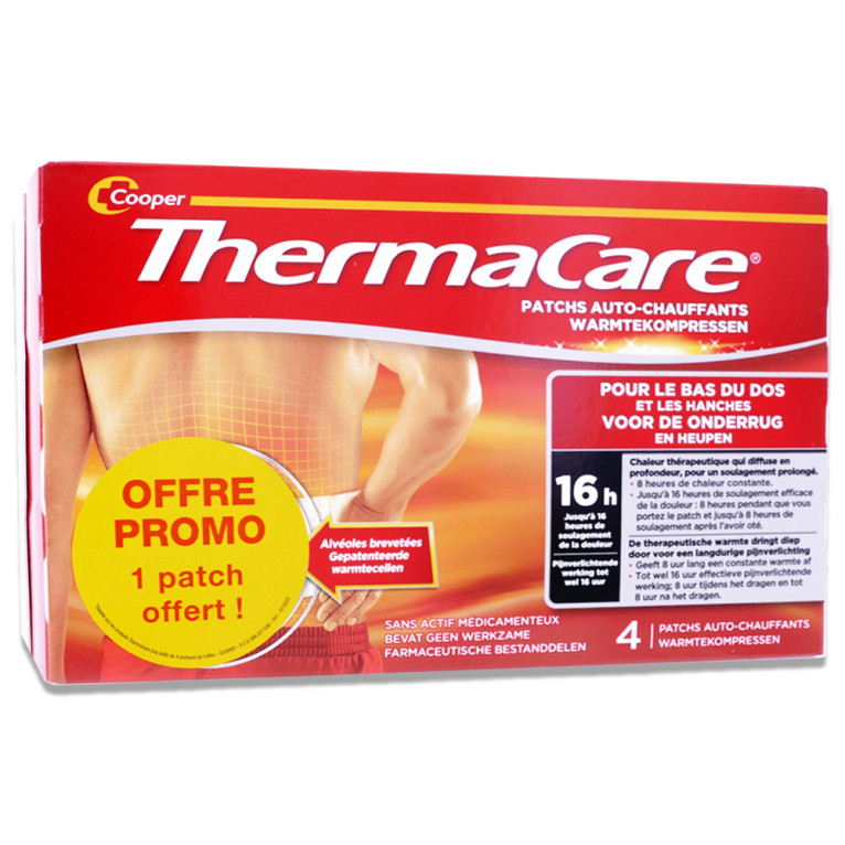 THERMACARE PATCHS AUTO CHAUFFANTS 4 PATCHS est en vente en ligne sur le site de votre parapharmacie à prix discount, offrant un soulagement thermique pour le bas du dos et la hanche.