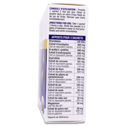 Complément alimentaire à base de plantesFructose, Poudre de jus de mangue, Agent de charge : Maltodextrine), Extrait d'eucalyptus, N-acétyl-L-cystéine, Extrait d'andrographis, Bromélaïne, Arôme mangue (2,5%) [Sulfite], Extrait de curcuma, Quercétine, Extrait de thym, Extrait de pépins de pamplemousse, Extrait de pin, Extrait de saule, Édulcorant, Sucralose, Extrait de radis noir, Oxyde de magnésium, Extrait de poivre noir.