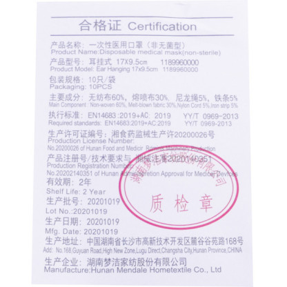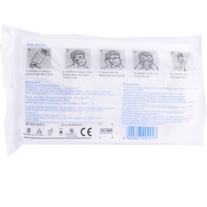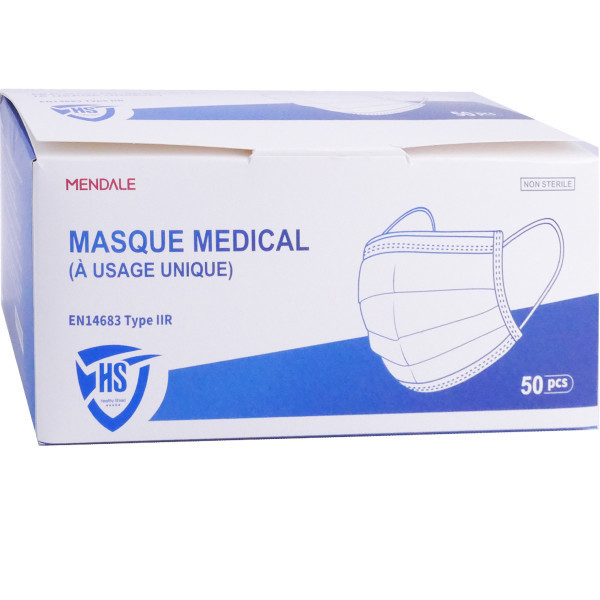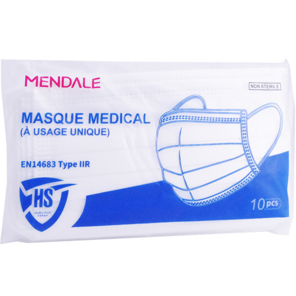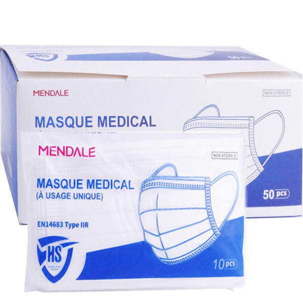 Les Masques chirurgicaux facial de protection jetable MENDALE sont non tissés, et à haute filtration (>98% sur les bactéries). Ils sont à utiliser en cas de maladie infectieuse afin de prévenir la contamination et protéger contre les gouttelettes, et pendant une opération chirurgicale. Ils ont été développés afin d'assurer un grand confort respiratoire grâce aux 3 couches. Ils sont non stériles et à usage unique. Chaque masque est composé de 60% de tissu non tissé en polypropylène ; 30% de tissus soufflé par effusion de polypropylène ; 5% bande métallique (pince-nez) ; et 5% élastiques auriculaires Rapide à mettre et à retirer, les masques possèdent des fixations auriculaires confortables. Les masques sont un Dispositif médical – marquage CE type IIR selon EN14683 2019+AC YY/T0969-2013.