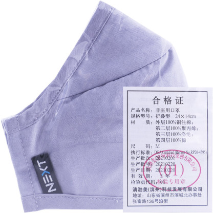 1 couche de protection coton infusé au cuivre 115g/m2 - 1 Couche de filtration 100% propylène(25 à 30g/m2) Meltblown technology Coefficient d'efficacité de filtration > 99 % - 1 couche de filtration et structure 100 % polyester (75 à 80 g/m2) Double rôle de filtration et structure 3D pour un maintien optimal - 1 couche de confort 100% coton (70g/m2) Confortable et doux pour la peau.