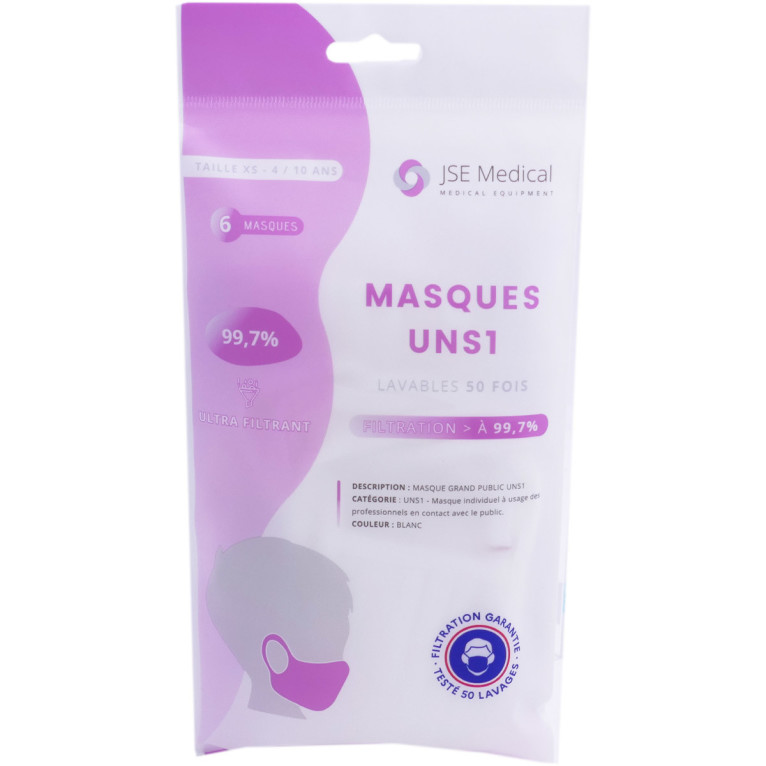 Ce Masque Barrière Réutilisable est un masque non médical UNS 1 lavable et réutilisable 20 fois (soit 8 centimes par utilisation), au pouvoir de rétention supérieur à 99%. Sachet de 6 masques. Pour les 4-10 ans