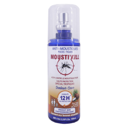 MOUSTI'KILL ANTI-MOUSTIQUES PUCES & TIQUES SENTEUR COCO 100ML en vente en ligne sur le site de votre parapharmacie à prix discount. Protégez-vous efficacement contre les piqûres de moustiques, puces et tiques avec ce spray à la senteur exotique noix de coco.