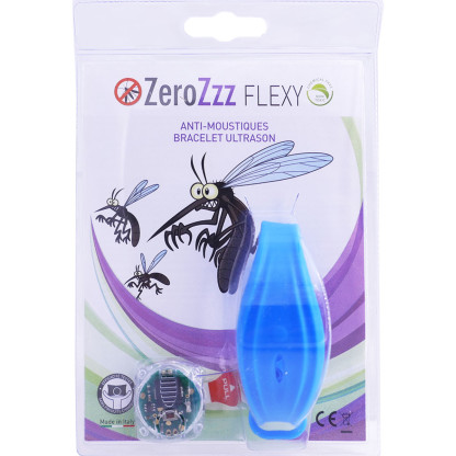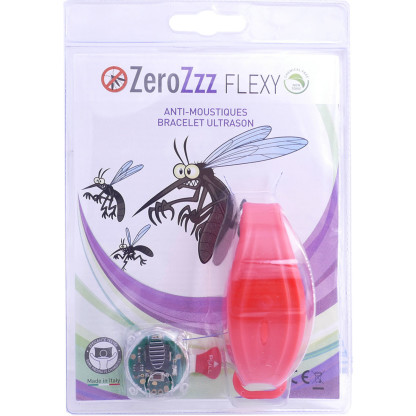 Anti-Moustiques Bracelet Ultrason de ZEROZZ Flexy est dispositif astucieux sous forme de bracelet pour éloigner, sans danger, les moustiques autour de soi à une distance de 3 mètres. Les ultrasons de 3 intensités différentes imitent le bourdonnement du moustique mâle, et ainsi repousse efficacement les moustiques femelles qui piquent. Pratique le bracelet permet de l’utiliser simplement en l’accrochant à un sac ou une poussette, ou en le portant au poignet. Produit testé par un organisme certifié sur le plan de la compatibilité électromagnétique. Efficacité testée à l'université. Sans produit chimique il est inoffensif pour l’homme et l’animal.