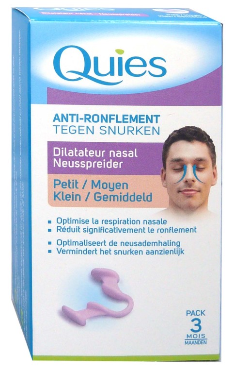 Le laboratoire QUIES conçoit des produits adaptés au confort quotidien par des protections auditives, oculaires, des anti-ronflements,…Anti ronflement Dilatateur nasal se place sur les fosses nasales pour libérer les voies respiratoires. Ainsi l’air circule mieux au niveau du nez et diminue fortement les ronflements et la congestion nasale. Il peut également être utilisé pour faciliter la respiration lors d’épreuve sportives. Très simple d’utilisation, elle s’adapte à la forme des dents pour un confort maximal sans gêne pour respirer ou ouvrir la bouche. Prouvée cliniquement 75% des patients sur 137 testeurs ont approuvé une diminution des ronflements.