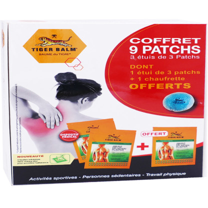 Le Coffret Baume du Tigre discount TIGER BALM, 9 patchs à usage unique dans votre parapharmacie en ligne à prix discount, qui soulagent les douleurs articulaires et musculaires par l'effet de la chaleur naturelle pendant 4 heures environ. 9 patchs + Chaufrette offerte