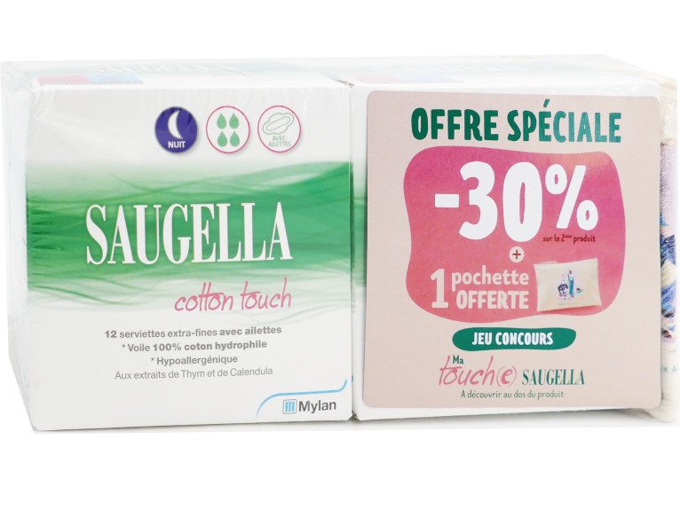 Les serviettes extra-fines Nuit Cotton Touch de SAUGELLA dans votre parapharmacie en ligne discount, s’utilisent au quotidien pour toutes les femmes même à la peau sensible pour une protection optimale pendant le sommeil. Pochette offerte