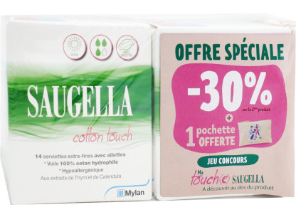 Les serviettes extra-fines Jour Cotton Touch de SAUGELLA dans votre parapharmacie en ligne discount, s’utilisent au quotidien pendant les règles pour toutes les femmes même à la peau sensible pour une protection optimale toute la journée. Pochette offerte