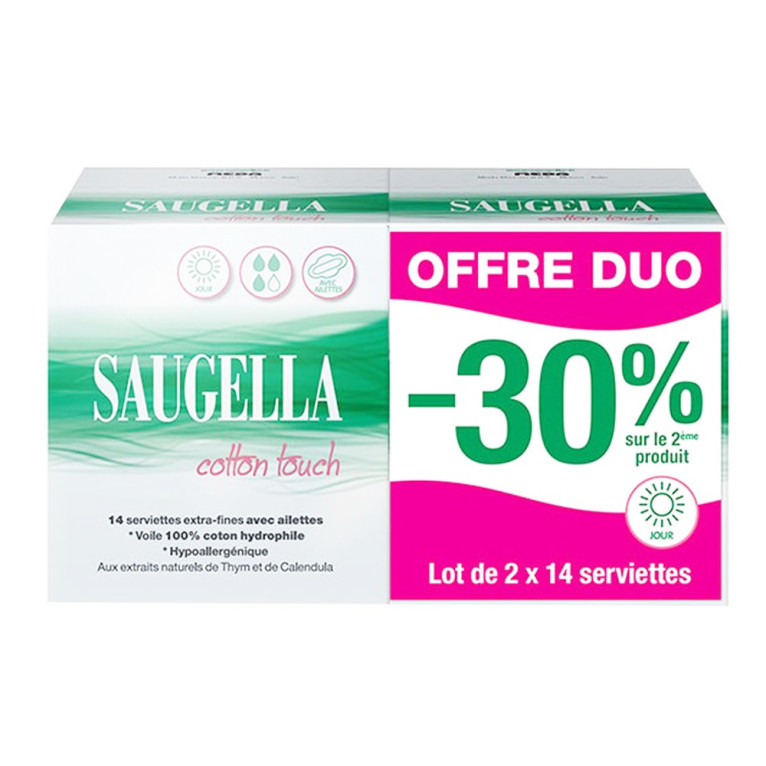 Découvrez le lot de 2x14 serviettes jour Saugella Cotton Touch, en vente en ligne sur le site de votre parapharmacie à prix discount.