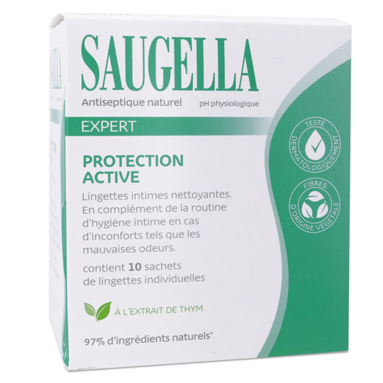 SAUGELLA EXPERT PROTECTION ACTIVE LINGETTES INTIMES 10 SACHETS est en vente en ligne sur le site de votre parapharmacie à prix discount, offrant une solution pratique pour l'hygiène intime, idéale pour une utilisation quotidienne.
