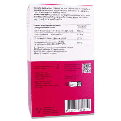 Issu du Laboratoire CCD, ce complément alimentaire est formulé avec des extraits de tamarin et de cynorrhodon, reconnus pour leurs propriétés bénéfiques. Le tamarin contribue à la régularité du transit intestinal, tandis que le cynorrhodon participe à la fonction de la vessie et rénale. Les extraits de canneberge et les lactobacilles tyndallisés complètent cette formule.