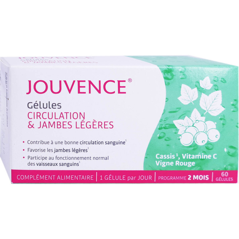 Jouvence Circulation & Jambes légères est un complément alimentaire en gélules composé de poudre de Cassis qui contribue à une bonne circulation sanguine, favorise la sensation de jambes légères et participe au fonctionnement normal des vaisseaux sanguins. Une action renforcée par l'association de la vitamine C qui contribue à la formation normale de collagène qui est également utile pour le fonctionnement normal des vaisseaux sanguins et qui aide à la protection des cellules contre le stress oxydatif. L'extrait de feuille de Vigne rouge vient complétée cette formule