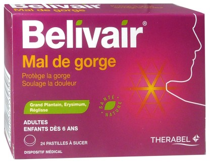 Mal de gorge BELVAIR à prix discount, le dispositif médical sous forme de pastilles dans votre parapharmacie en ligne discount, pour soulager les maux de gorge de toute la famille lors d’enrouements, douleur, toux, sensations de brûlures et de sècheresse, irritations des voies respiratoires supérieures. A partir de 6 ans