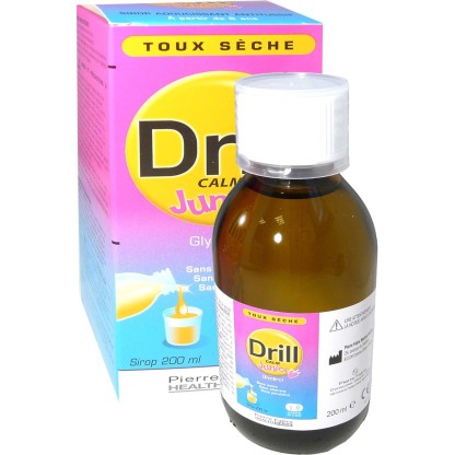 Drill Calm Junior des laboratoires PIERRE FABRE discount, la tradition officinale dans votre parapharmacie en ligne à prix discount, dans un complément alimentaire sous forme de sirop pour soulager les maux de gorges lors de toux sèches chez les enfants (à partir de 6 ans).