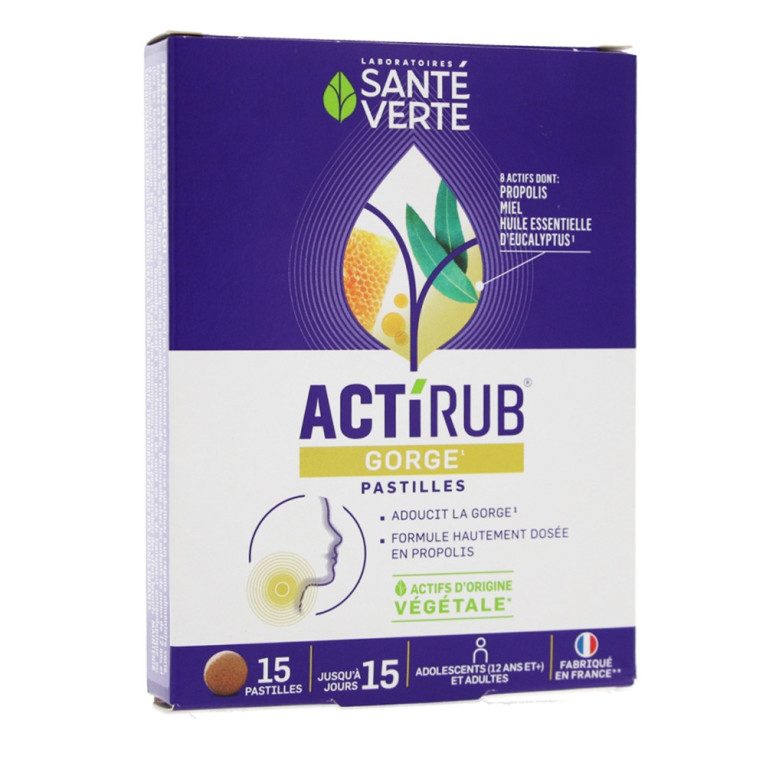 ACTIRUB PASTILLES POUR LA GORGE à prix discount de SANTE VERTE, le complément alimentaire en pastilles à base de préparation de plantes dont l'échinacée, d'huile essentielle d'eucalyptus, et de Vitamine C disponible dans votre parapharmacie en ligne à prix discount.