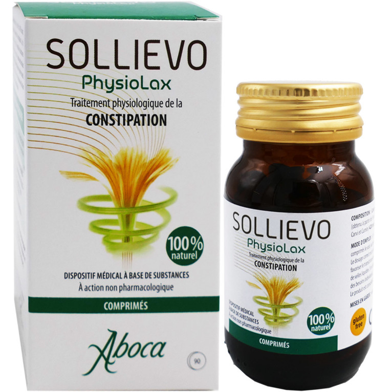 SOLLIEVO PHYSIOLAX Constipation du laboratoire ABOCA est un dispositif médical à base de substances à action physiologique 100% naturelles qui va participer aux processus digestifs physiologiques et va agir comme un support pour le transit intestinal. Il est composé notamment de Séné, de Chicorée, de Fenouil, de Pissenlit, de Carvi et de Cumin.