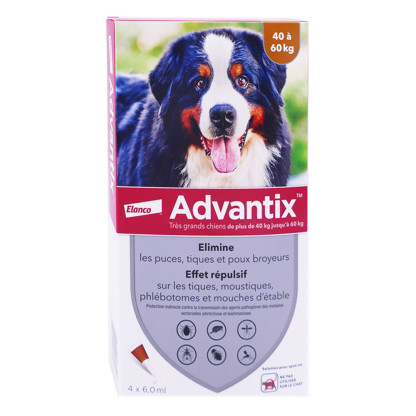 Advantix Chien de BAYER discount, les pipettes antiparasitaires dans votre parapharmacie en ligne à prix discount, pour lutter contre les puces, les poux, les moustiques et les tiques chez les très grands chiens de 40 à 60kg.