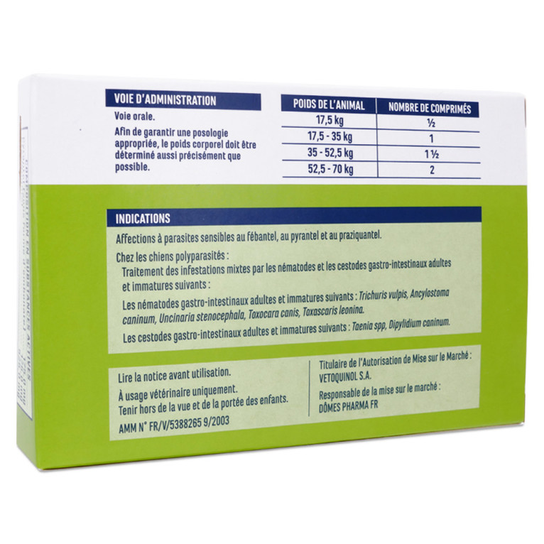 Un comprimé contient :Substance(s) active(s) :Pyrantel (sous forme d’embonate) : 175 mg Praziquantel : 175 mg Fébantel : 525 mg