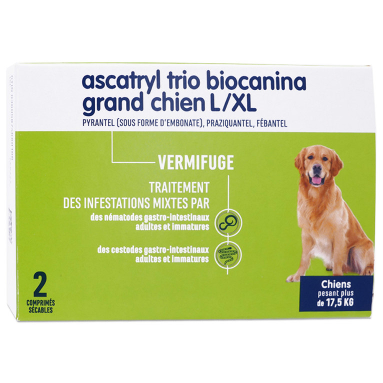 BIOCANINA VERMIFUGE ASCATRYL TRIO GRAND CHIEN L/XL 2 COMPRIMÉS est en vente en ligne sur le site de votre parapharmacie à prix discount, idéal pour l'hygiène intestinale des grands chiens.