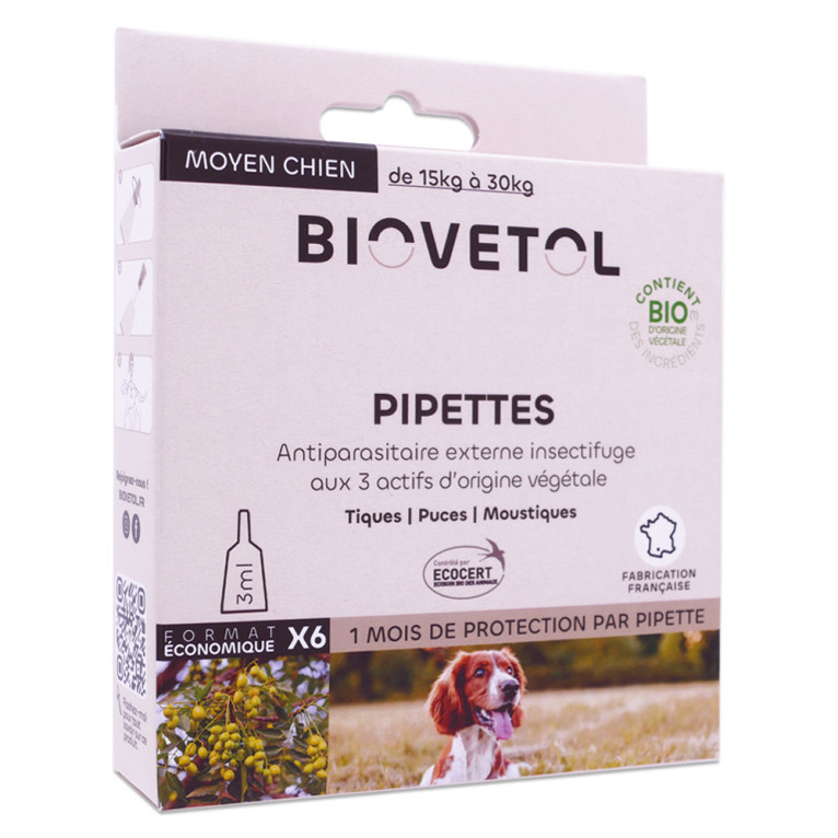 BIOVETOL ANTIPARASITAIRE PIPETTES MOYEN CHIEN 6X3ML