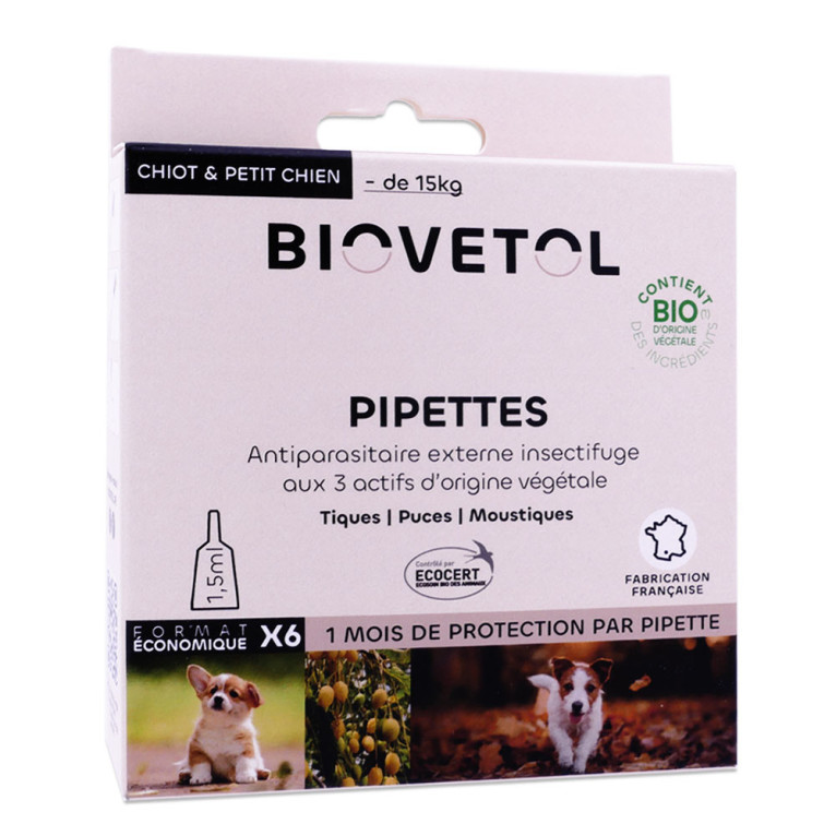 BIOVETOL PIPETTES ANTIPARASITAIRE CHIOT ET PETIT CHIEN 6X1,5ML en vente en ligne, sur le site de votre parapharmacie à prix discount, est la solution idéale pour protéger votre compagnon à quatre pattes des parasites externes. Chiot et petit Chien de - de 15kg