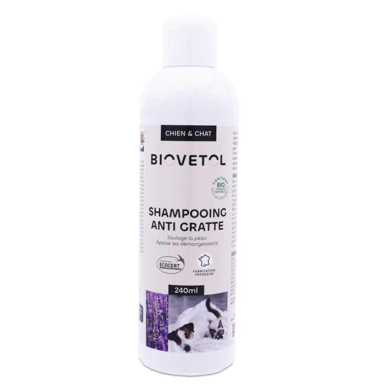 BIOVETOL SHAMPOOING ANTI GRATTE CHIEN & CHAT 240ML en vente en ligne, sur le site de votre parapharmacie à prix discount, est la solution idéale pour apaiser les démangeaisons de vos compagnons à quatre pattes.