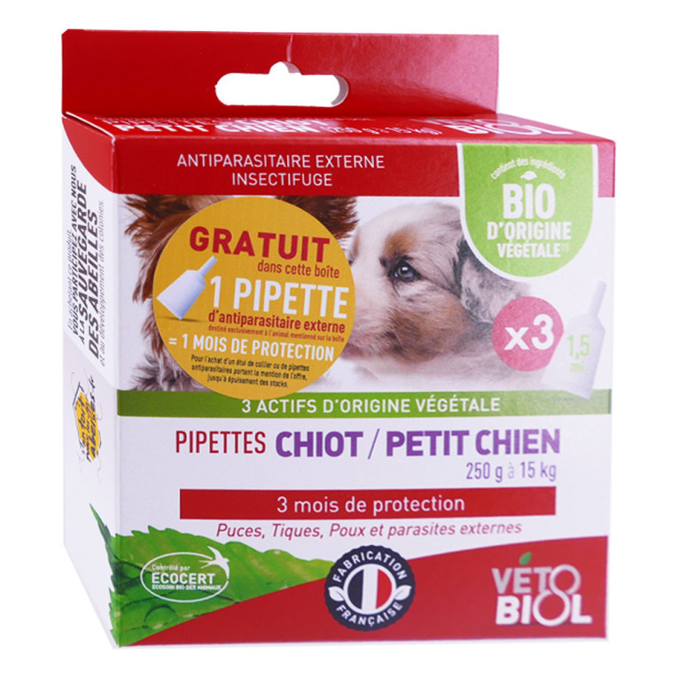 VETOBIOL BIO ANTIPARASITAIRE PIPETTES CHIOT/PETIT CHIEN 3X1.5ML
