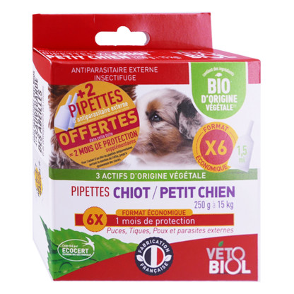 VETOBIOL BIO ANTIPARASITAIRE PIPETTES CHIOT/PETIT CHIEN 6X1.5ML