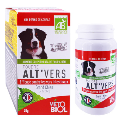 Découvrez la solution naturelle pour protéger votre fidèle compagnon contre les parasites avec VETOBIOL BIO POUDRE ALT'VERS. Ce produit est un aliment complémentaire, développé par le laboratoire VETOBIOL, est spécialement conçu pour les grands chiens.
