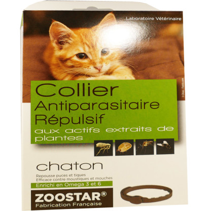 La marque ZOOSTAR du laboratoire AB7 Santé est destinée à protéger les animaux des parasites et à en prendre soin par des produits naturels fabriqués en France respectueux de l’animal et de l’environnement. Ce collier antiparasitaire répulsif pour chaton est imprégné d’un produit formulé à base d’extrait de Margosa, actif végétal et riche en oméga 3 et 6, qui agit naturellement contre l’infestation et le développement des puces et des tiques. Il sera également efficace sur les moustiques et les mouches. Le collier ne contient pas d’insecticides de synthèse et résiste à l’eau et aux shampooings. Pratique, le collier n’étrangle pas le chaton lors de pendaison accidentelle grâce à son système de sécurité qui permet au collier de se détacher. 1 collier assure trois à quatre mois de protection. Ne pas utiliser chez les chats de moins de 4 mois.