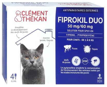 Le laboratoire CLEMENT THEKAN conçoit des produits et soins vétérinaires pour le bien-être des animaux de compagnie (shampooing, traitement puce anti-tique,…). Fiprokil Duo est un médicament vétérinaire anti-parasitaire sous forme de pipettes simple à appliquer, qui agit sur la protection et le traitement des insectes chez le chat pesant entre 1 et 6kg et son environnement. Il permet de tuer les puces et d’éliminer les tiques en limitant la transmission de la maladie de la piroplasmose, et de protéger contre la ré infestation et l’environnement de l’animal grâce au fipronil et à la pyriproxifène. Les chats sont protégés pendant 5 semaines de toute infestation par les puces, et protégés de la multiplication des puces en luttant contre le développement des œufs de puce pendant 12 semaines. L’animal et son environnement est protégé des infestations des tiques pendant 1 semaine.