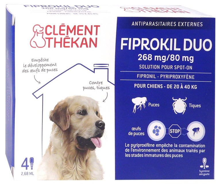 Le laboratoire CLEMENT THEKAN conçoit des produits et soins vétérinaires pour le bien-être des animaux de compagnie (shampooing, traitement puce anti-tique,…). Fiprokil Duo est un médicament vétérinaire anti-parasitaire sous forme de pipettes simple à appliquer, qui agit sur la protection et le traitement des insectes chez le chien pesant entre 20 et 40kg et son environnement. Il permet de tuer les puces et d’éliminer les tiques en limitant la transmission de la maladie de la piroplasmose, et de protéger contre la ré infestation et l’environnement de l’animal grâce au fipronil et à la pyriproxifène. Les chiens sont protégés pendant 7 semaines de toute infestation par les puces, et protégés de la multiplication des puces en luttant contre le développement des œufs de puce pendant 12 semaines. L’animal et son environnement est protégé des infestations des tiques pendant 2 semaines.