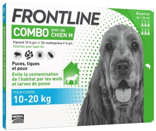 MERIAL, leader sur le marché mondial de santé animale, développe des produits destinés aux soins et à la santé de nos animaux de compagnie, à travers notamment la gamme FRONTLINE qui propose des traitements redoutables conçus pour éliminer les tiques et les puces chez les chats et les chiens. FRONTLINE Combo chien 10-20 kg pipettes s’applique très facilement en se déposant sur la peau de l’animal, et permet d’éradiquer les puces, les tiques et les poux d’animaux. La formule de FRONTLINE Combo se concentre dans les glandes sébacées de l’animal sans passer dans le sang et reste efficace plusieurs semaines, même en cas de contact avec de l’eau. FRONTLINE agit sur les puces adultes dans les 24 heures suivant leur infestation sur l’animal, élimine 90% des tiques et 100% des poux des chiens et chats en 48h maximum. FRONTLINE Combo assure une sécurité optimale grâce à sa formule enrichie d’un régulateur de croissance des parasites qui stoppe la contamination éventuelle de l’habitat par les larves ou les œufs pondus avant la mort des puces.