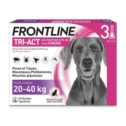 FRONTLINE TRI-ACT chien discount 20-40 kg pipettes, l’efficacité redoutable 3en1 dans votre parapharmacie en ligne à prix discount, pour repousser, traiter et prévenir l’infestation de puces, tiques et insectes volants.